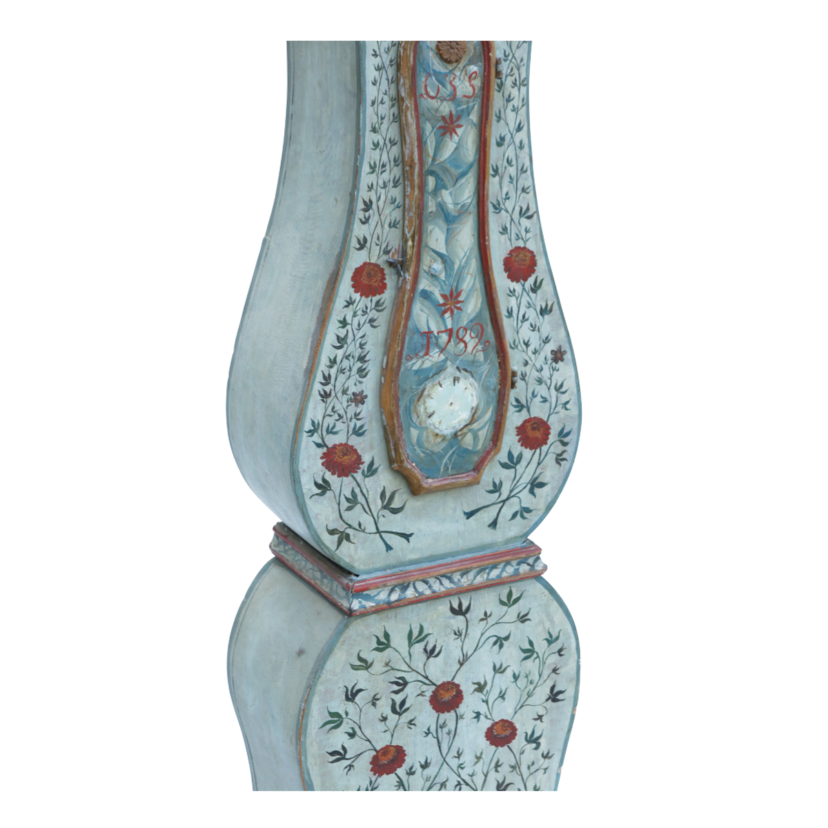 Antique Swedish Mora clock in blue with hand painted floral details and the date of the clock 1782 painted on the body. Working Longcase clock mechanism of pendulum and 2 weights and a bell chime on the hour.