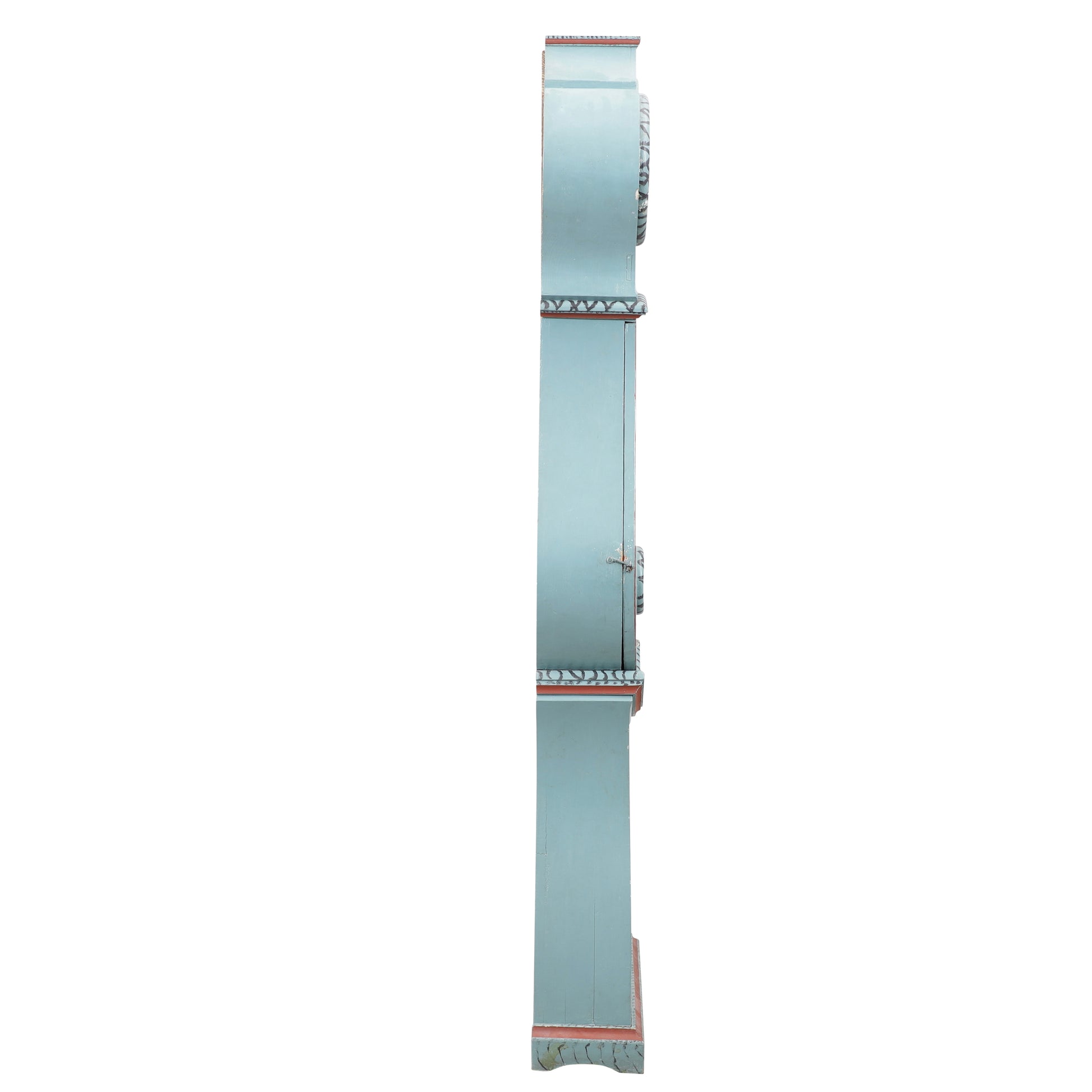 Antique Swedish Mora clock in blue with hand painted details. Working Longcase clock mechanism of pendulum and 2 weights and a bell chime on the hour.